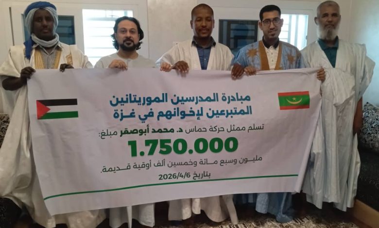 سلمت مبادرة المدرسين الموريتانيين المتبرعين لأخوانهم في غزة مبلغ مليون وسبعمائة وخمسين ألف أوقية قديمة لممثل حركة حماس في موريتانيا…