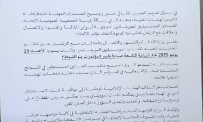 حددت وزارة الثقافة والفنون والاتصال والعلاقات مع البرلمان يوم 29 يونيو الجاري موعدًا لتنظيم انتخابات اتحاد الفنانين الموسيقيين الموريتانيين، وذلك…